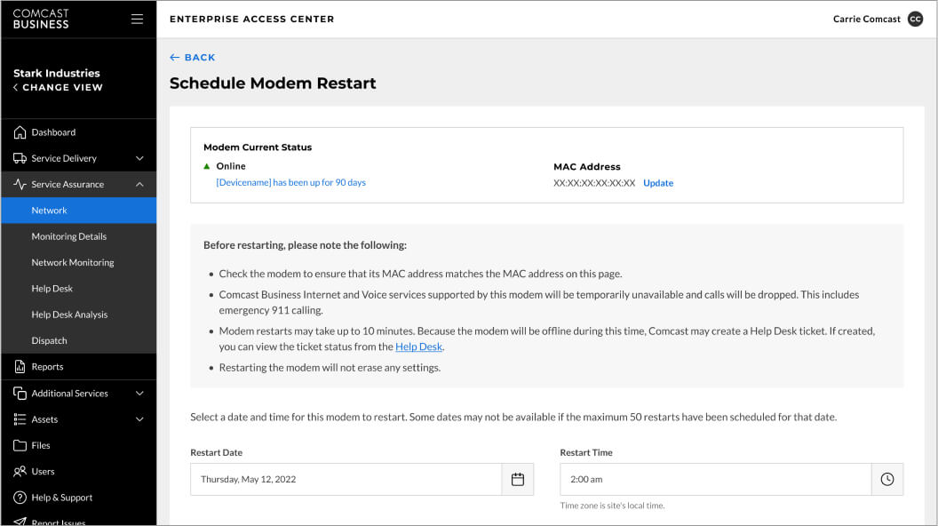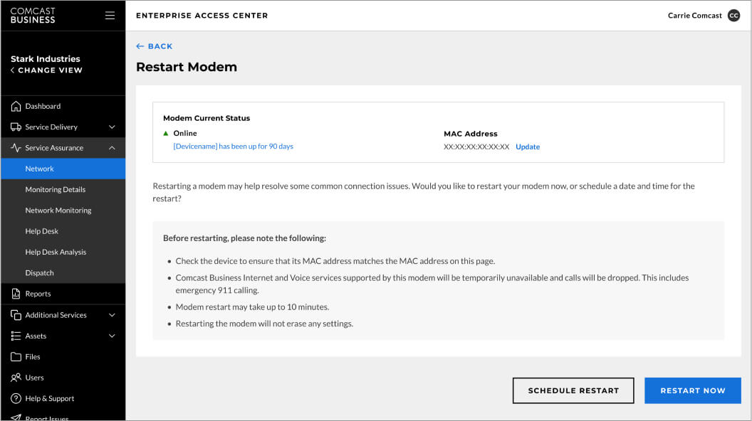 With the new self-service modem restart, Comcast Business added increased troubleshooting functionality to its industry-leading Enterprise Access Center. This enhancement does not require any additional hardware and even allows customers to restart modems that Comcast Business does not directly monitor. Customers can now restart single or multiple internet modems at various site locations in real-time, as well as schedule a restart after-hours that won’t interfere with day-to-day operations to support routine device maintenance.