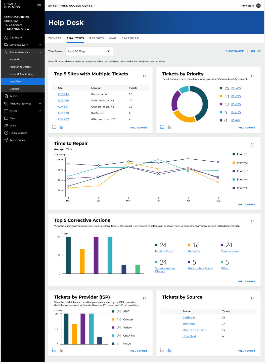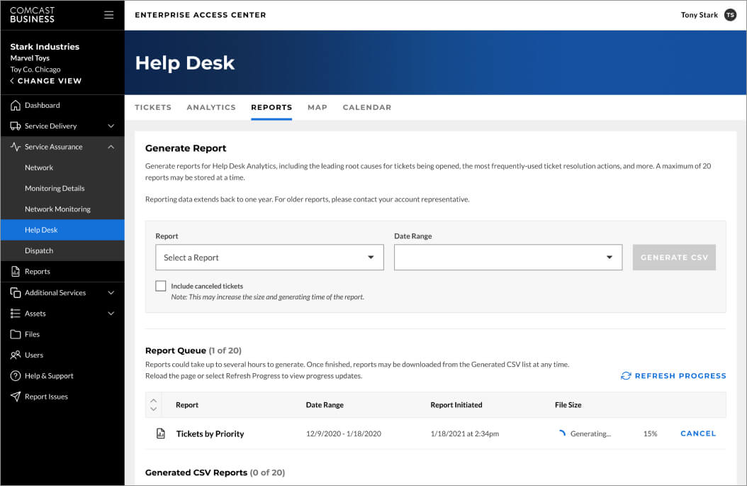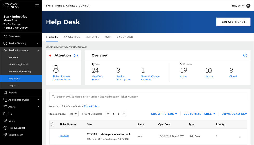 Comcast Business further enhances customer experience with Help Desk analysis and reporting, which enables both high-level data visualizations and the ability for users to drill down for more detailed and granular information. Real-time data and reports can be generated daily, weekly or monthly, or filtered by date range, helping to create a comprehensive Help Desk solution with the ability to not just create but also manage, view, and analyze tickets across all customer locations. Help Desk functionality is in fact the most utilized solution in the Enterprise Access Center (EAC) year after year, with Help Desk, Ticket Details and Dashboard-Overview driving over 85% of total page views for the past year. With this level of robust and valuable data at their fingertips, customers no longer need to reach out to their Comcast Account team for critical insights.
